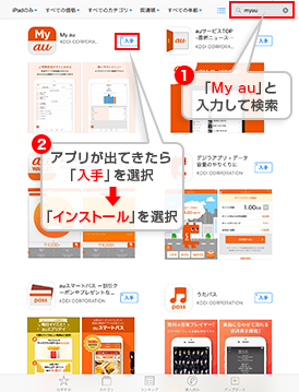 検索結果に「My au」が出てきたら、「入手」を押します。