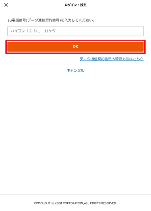au/UQ mobile電話番号(データ通信契約番号)を入力し「OK」を押します。