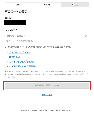 画面上部でau IDを確認し、「パスワード」を入力し「利用規約に同意して次へ」を押します。